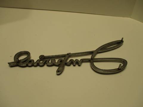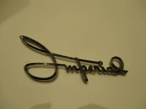 1957-58 Imperial nameplate, decent used condition, has one broken mounting pin.