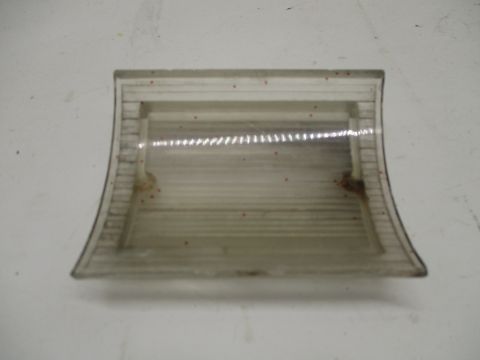1967 Plymouth Belvedere left backup light lens, used condition. Piece has a chip on backside (not visible when mounted) and a damaged screw hole.