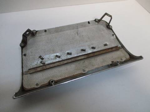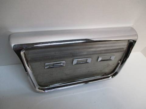 1963-64 Chrysler 300 rear speaker grille, good used condition, shiny and decent chrome, light pitting, numbers are good but grille mesh is dented and pulled loose at the bottom. Fits all hardtops and convertibles.
