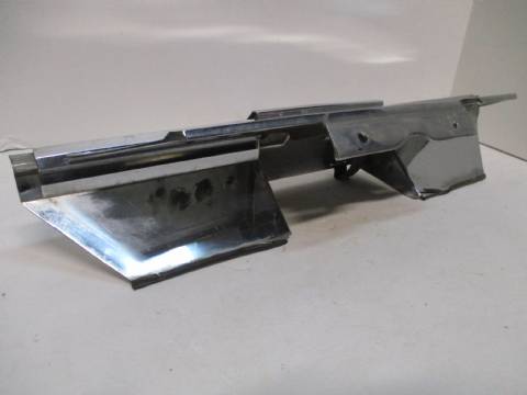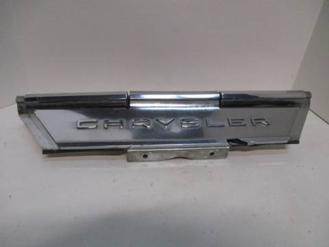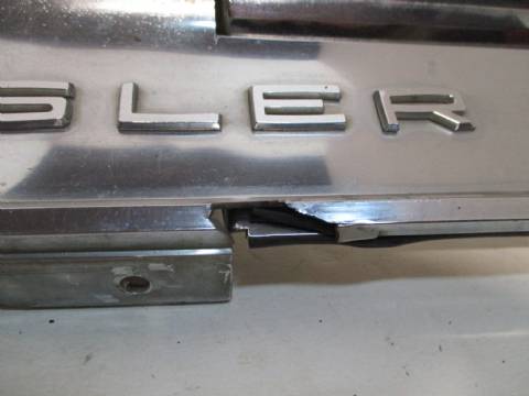 1964 Chrysler 300 fuel filler door, used condition, shiny chrome that is not pitted, has a small piece broken out below the L and E.