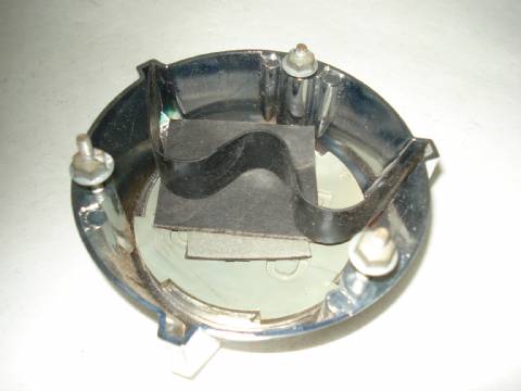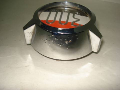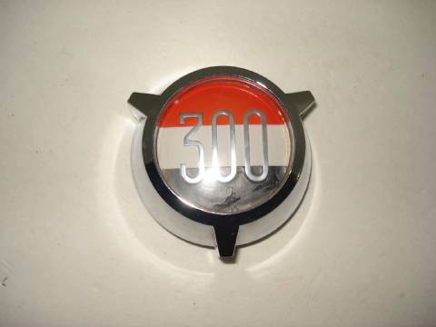 1961 Chrysler 300 G rear seat medallion, nice used condition, shiny chrome, has pitting on top side, uncracked plastic emblem.