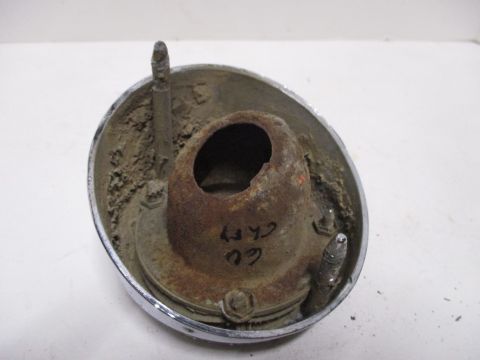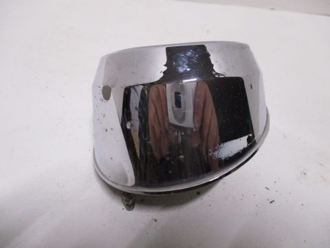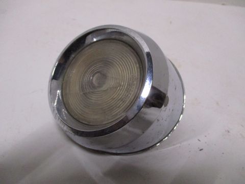 1960 Chrysler right backup light assembly, used condition. Chrome is shiny but has pitting, lens is cracked, inner housing is good.