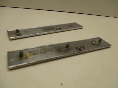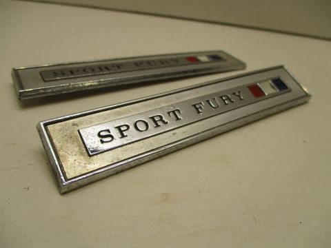 1967 Plymouth Sport Fury pair of "Sport Fury" nameplates, good used condition. Fit on interior door panels. One has all 3 mounting pins intact, but the other has only one pin.