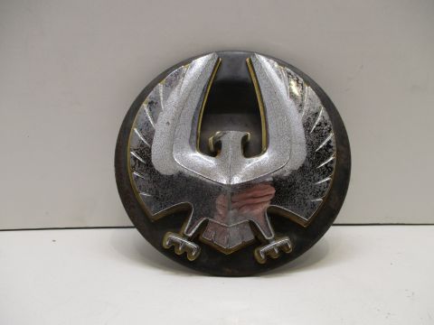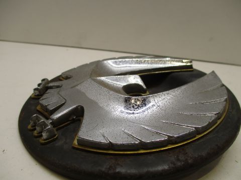 1964-66 Imperial Lebaron fuel filler door ornament and backing, good used condition. Piece has gold backing behind eagle, and chrome is speckled but not pitted.