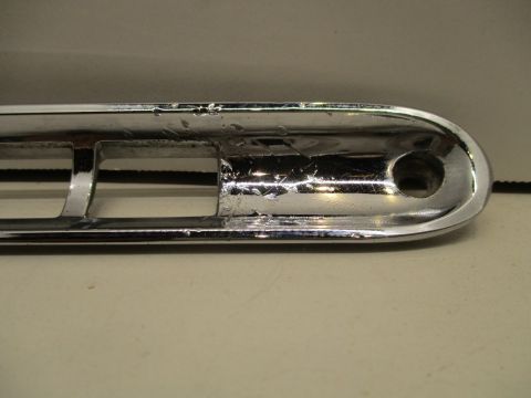 1960-61 Dodge transmission pushbutton bezel, good used condition. Piece is not pitted, but has some nicks in chrome.